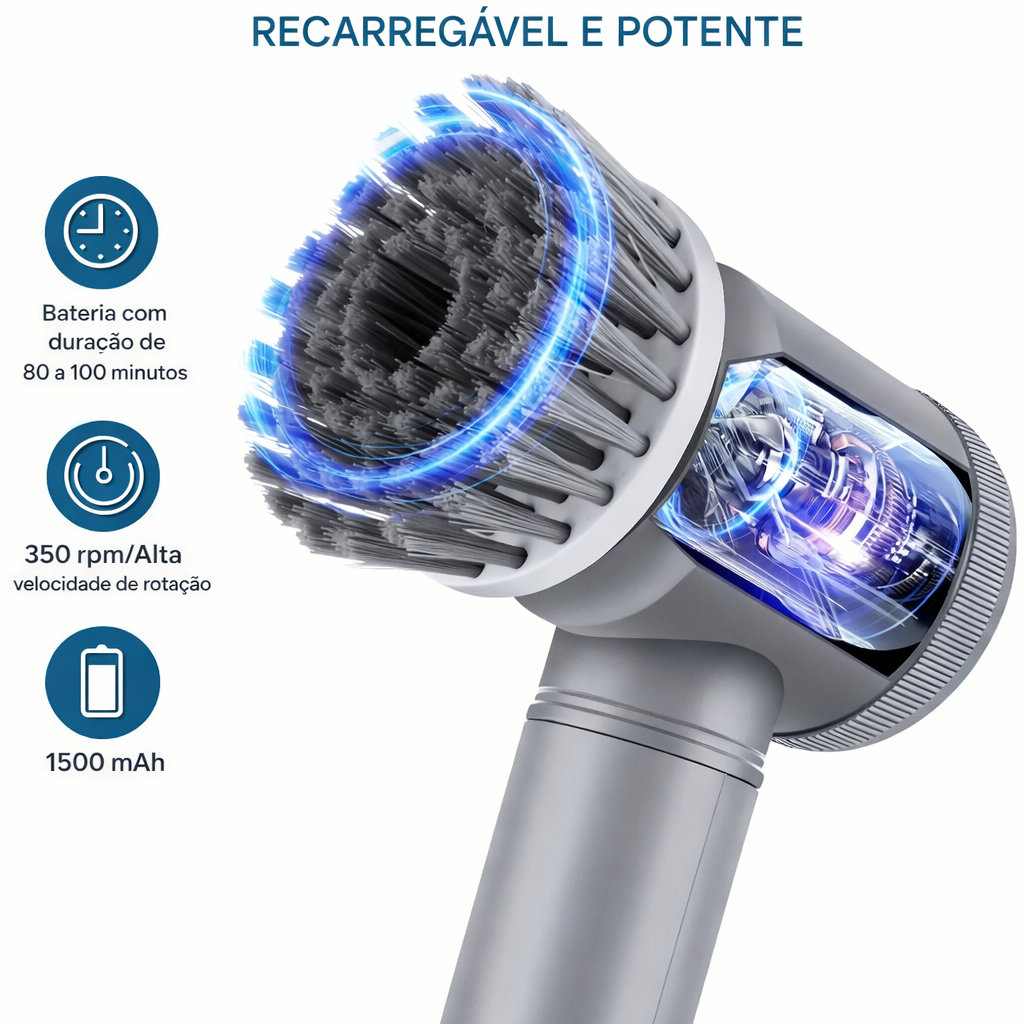 Com bateria recarregável de alta capacidade, a Escova Elétrica Multiuso funciona por até 60 a 90 minutos contínuos após uma carga completa. Isso permite realizar limpezas completas em vários ambientes de uma só vez, sem precisar parar para recarregar.